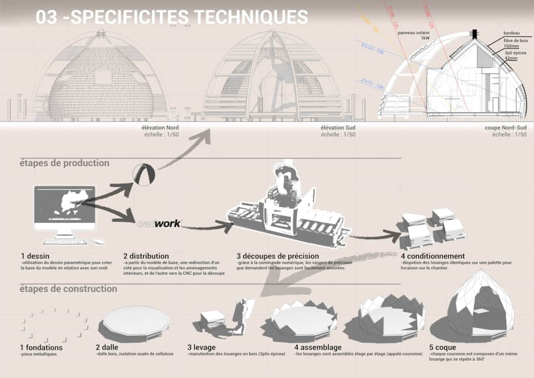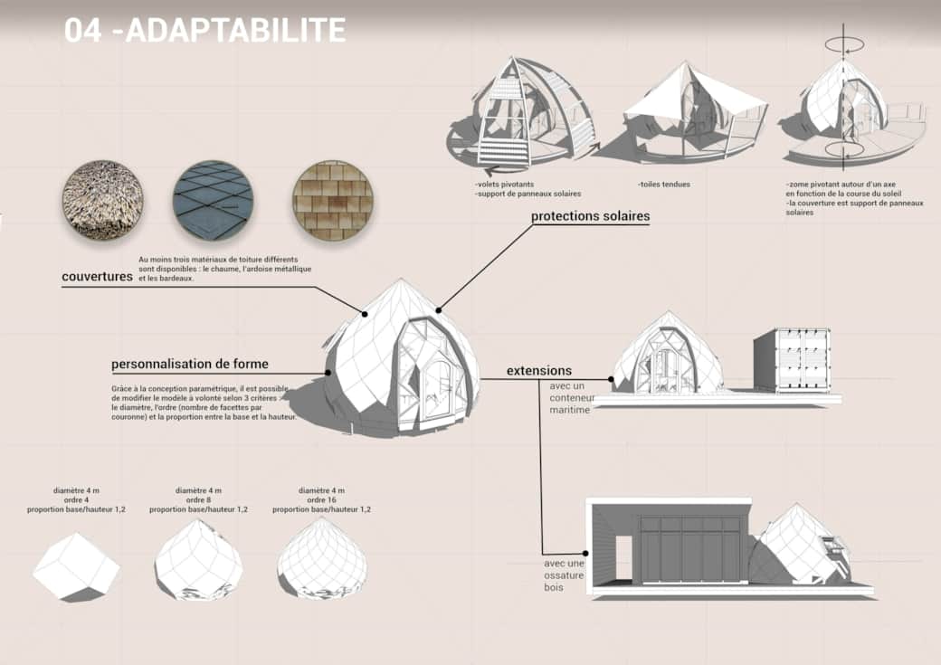 La forme circulaire, symbole de la Vie, enveloppe et relie les espaces. La gestion intelligente des énergies environnantes, les espaces intérieurs design et optimisés, ainsi qu’un système constructif moderne et innovant, intégrant les dernières technologies, simplifient la mise en œuvre et la rendent accessible à chacun — ouvrant ainsi la voie à des chantiers participatifs grâce à une structure répétitive et légère.