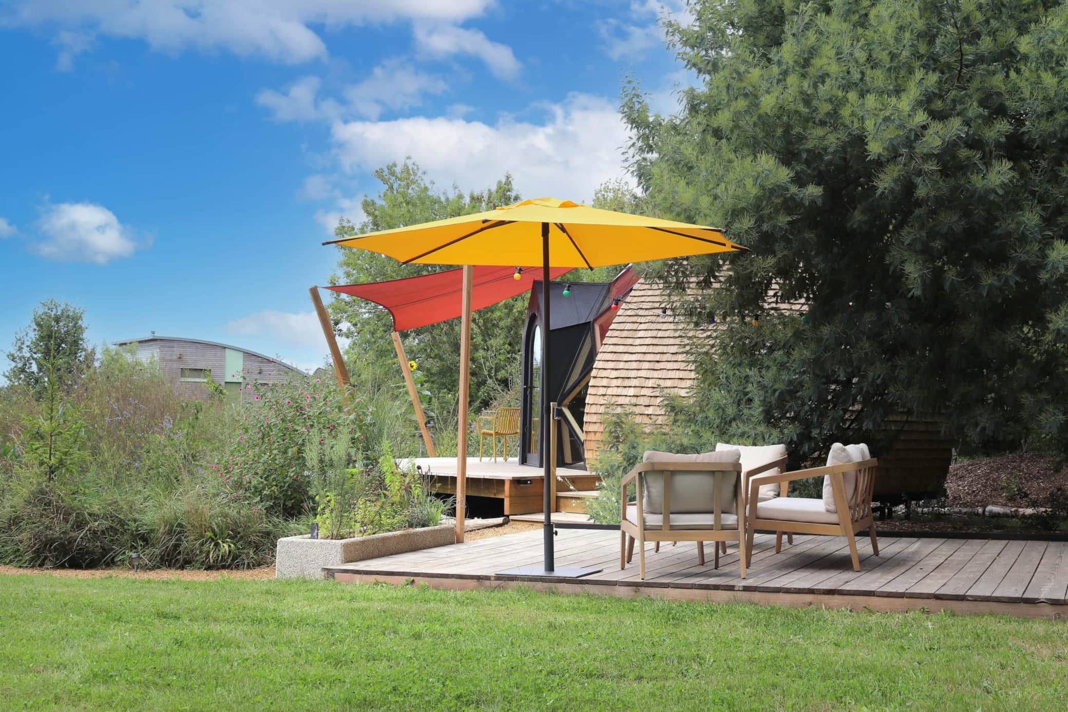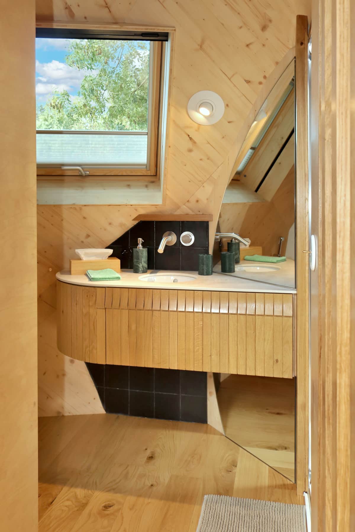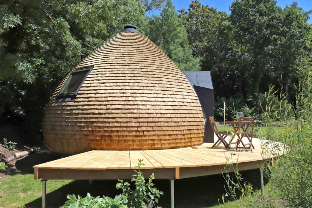 Cette forme ronde permet de le recouvrir de bardeaux de châtaignier, matériau noble et vivant, qui s’harmonise naturellement avec l’esprit du lieu.